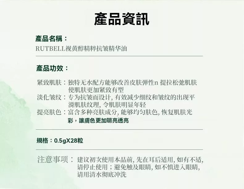 💡 RUTBELL視黃醇精粹抗皺精華油,是一款深受歡迎的抗皺精華產品。它蘊含著多種頂級成分,向你展示抗皺的終極秘笈!
