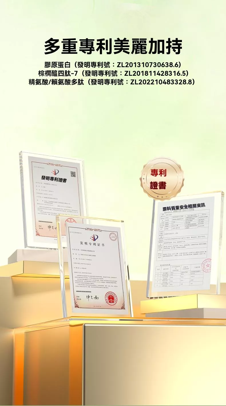 3大發明專利成分:可溶性膠原蛋白/專利號:ZL 2013 1 0730638.6,精氨酸/賴氨酸多肽/專利號:ZL 2022 1 0483328.8,棕櫚醯四肽-7/專利號:ZL 2022 1 0483328.8