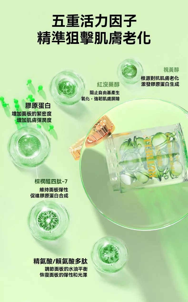 【明星成分】視黃醇、精氨酸/賴氨酸多肽、膠原蛋白、棕櫚醯四肽-7、紅沒藥醇、光果甘草和多重植萃。