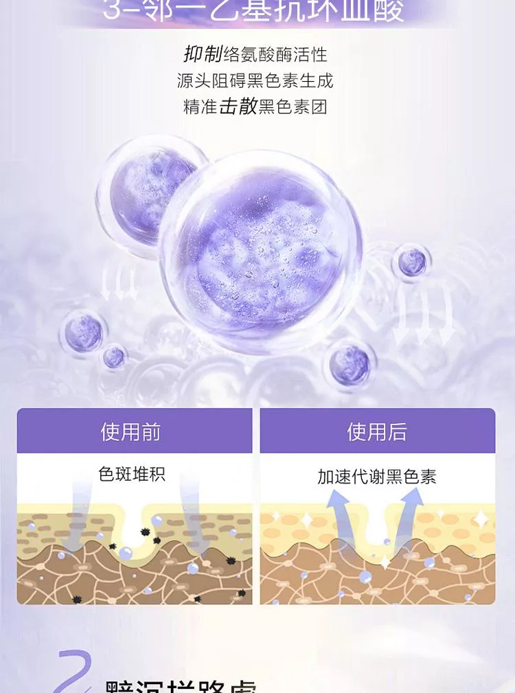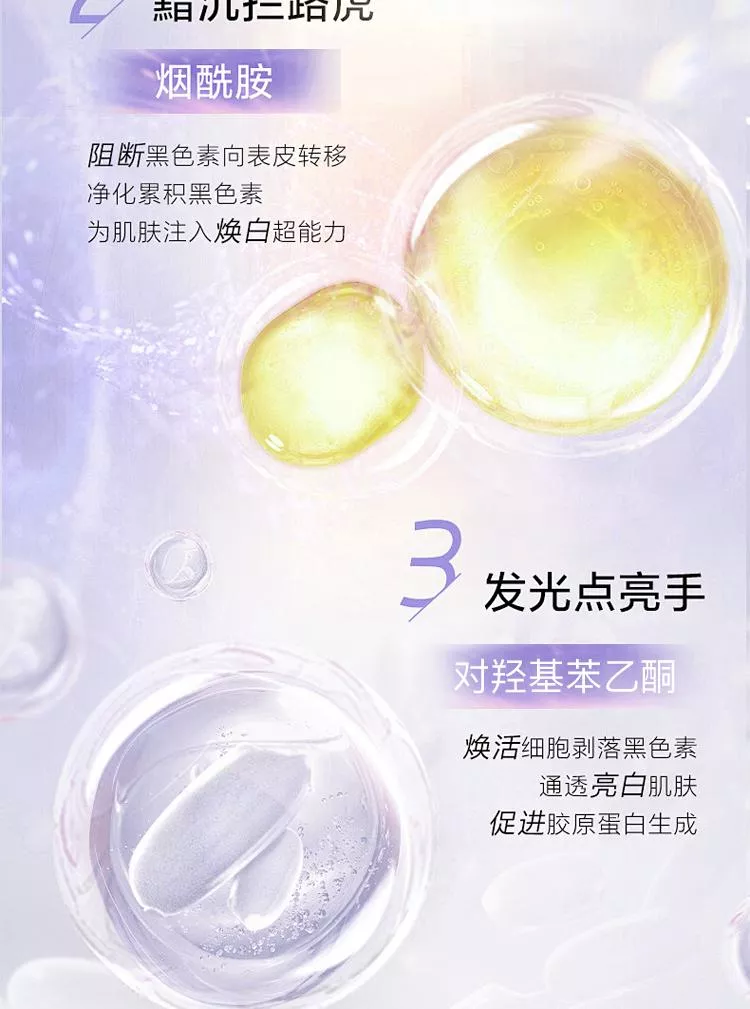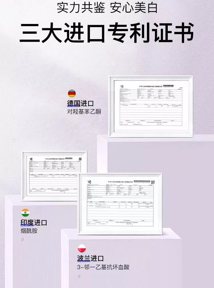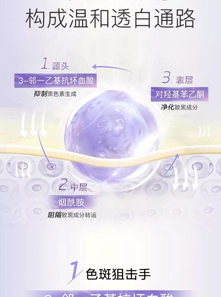 高濃度添加進口成分煙醯胺,抑制黑色素沉著,加速細胞新陳代謝。波蘭進口成分3-鄰乙基抗壞血酸,是人體皮膚重要組成部分,也是維生素C的衍生物,抑制黑色素產生,且穩定性強,滲透性更好。第三大王炸進口成分對羥基苯乙酮,天然植物提取物,具有抗氧化舒緩作用,對黑麯黴的殺菌能力很強,對銅綠假單胞菌也有一定的抑制效果。谷胱甘肽具有強大的抗氧化能力,在體內作為重要的抗氧化劑和自由基清除劑,如與自由基、重金屬結合,它會把體內有害的讀物轉化為無害物質,排泄出體外,同時還可以局端身體裡面黑色素生成。