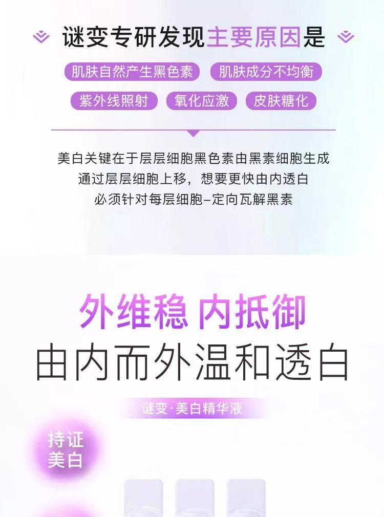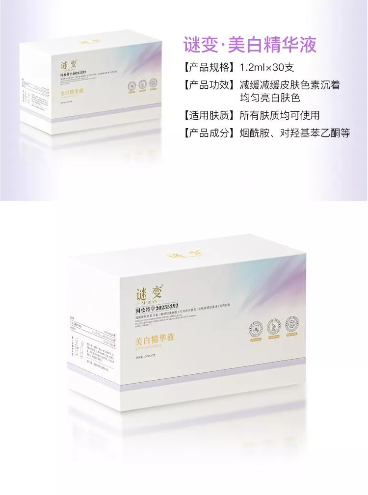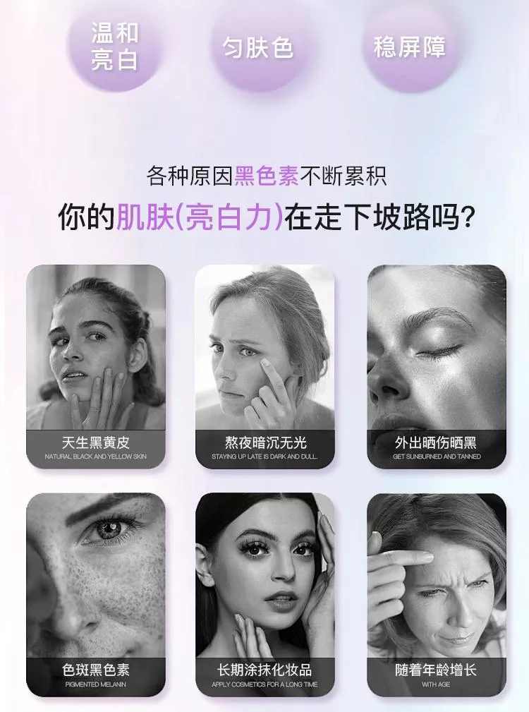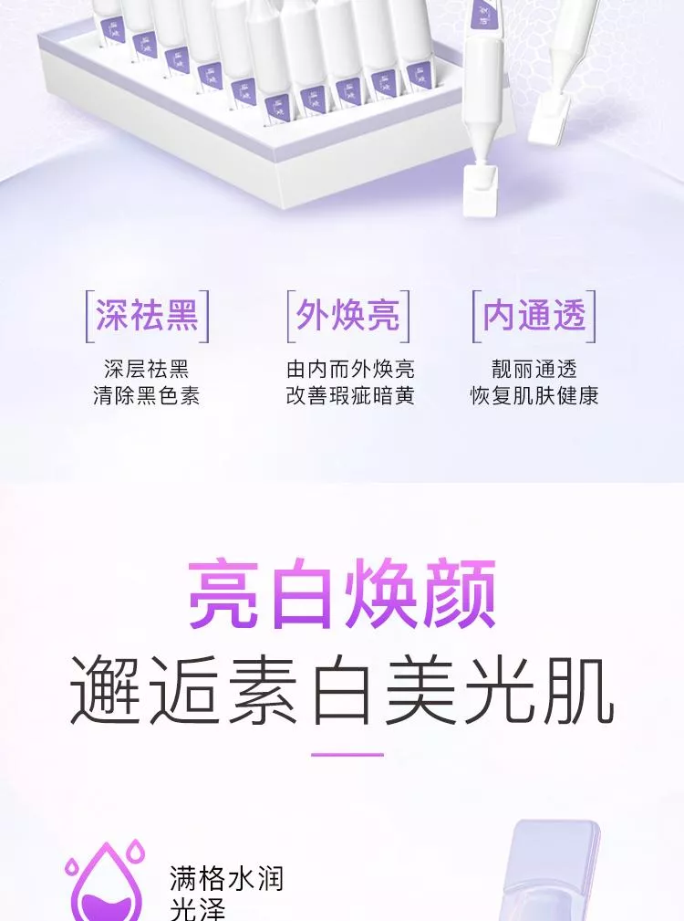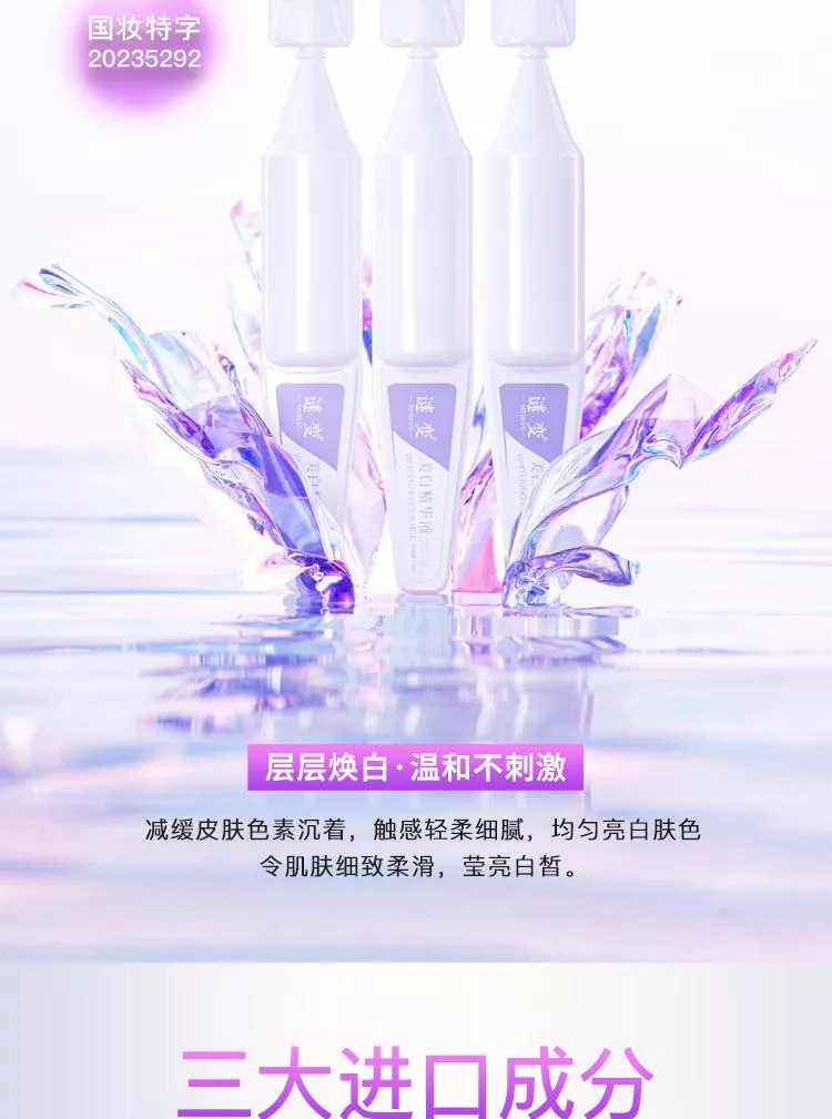 高濃度添加進口成分煙醯胺,抑制黑色素沉著,加速細胞新陳代謝。波蘭進口成分3-鄰乙基抗壞血酸,是人體皮膚重要組成部分,也是維生素C的衍生物,抑制黑色素產生,且穩定性強,滲透性更好。第三大王炸進口成分對羥基苯乙酮,天然植物提取物,具有抗氧化舒緩作用,對黑麯黴的殺菌能力很強,對銅綠假單胞菌也有一定的抑制效果。谷胱甘肽具有強大的抗氧化能力,在體內作為重要的抗氧化劑和自由基清除劑,如與自由基、重金屬結合,它會把體內有害的讀物轉化為無害物質,排泄出體外,同時還可以局端身體裡面黑色素生成。