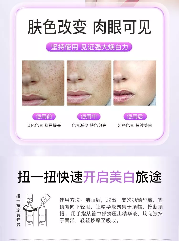 這款美白精華液柔和易吸收,每天早晚使用,按摩至吸收即可。堅持使用,你將驚喜地發現肌膚明顯變得更加紅潤、透亮,散發出迷人的光彩