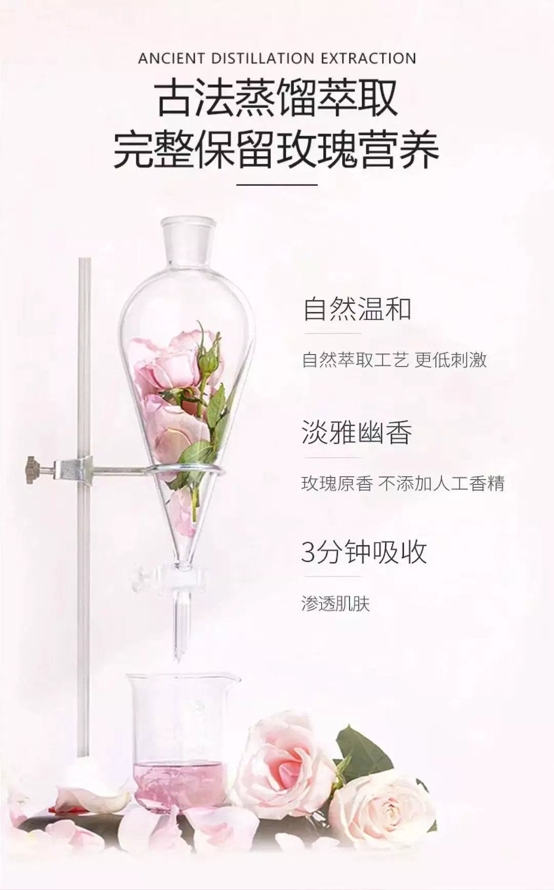 5、抗衰老作用 ,玫瑰純露中不僅富含多種維生素、葡萄糖、果糖、檸檬酸、蘋果酸等有益於人體健康的營養物質,還富含三萜類化合物(三萜類化合物具有很好的抗衰老作用),具有延緩皮膚衰老作用。可有效地去除皺紋。用來敷眼,可在短時間內消除疲勞,改善黑眼圈,使用後面容滋潤而富有光澤。預防皺紋、色斑、延緩皮膚衰老、安神、保濕、滋潤皮膚、舒緩緊張情緒、調整生理期迴圈、平衡肌膚酸鹼度等作用。