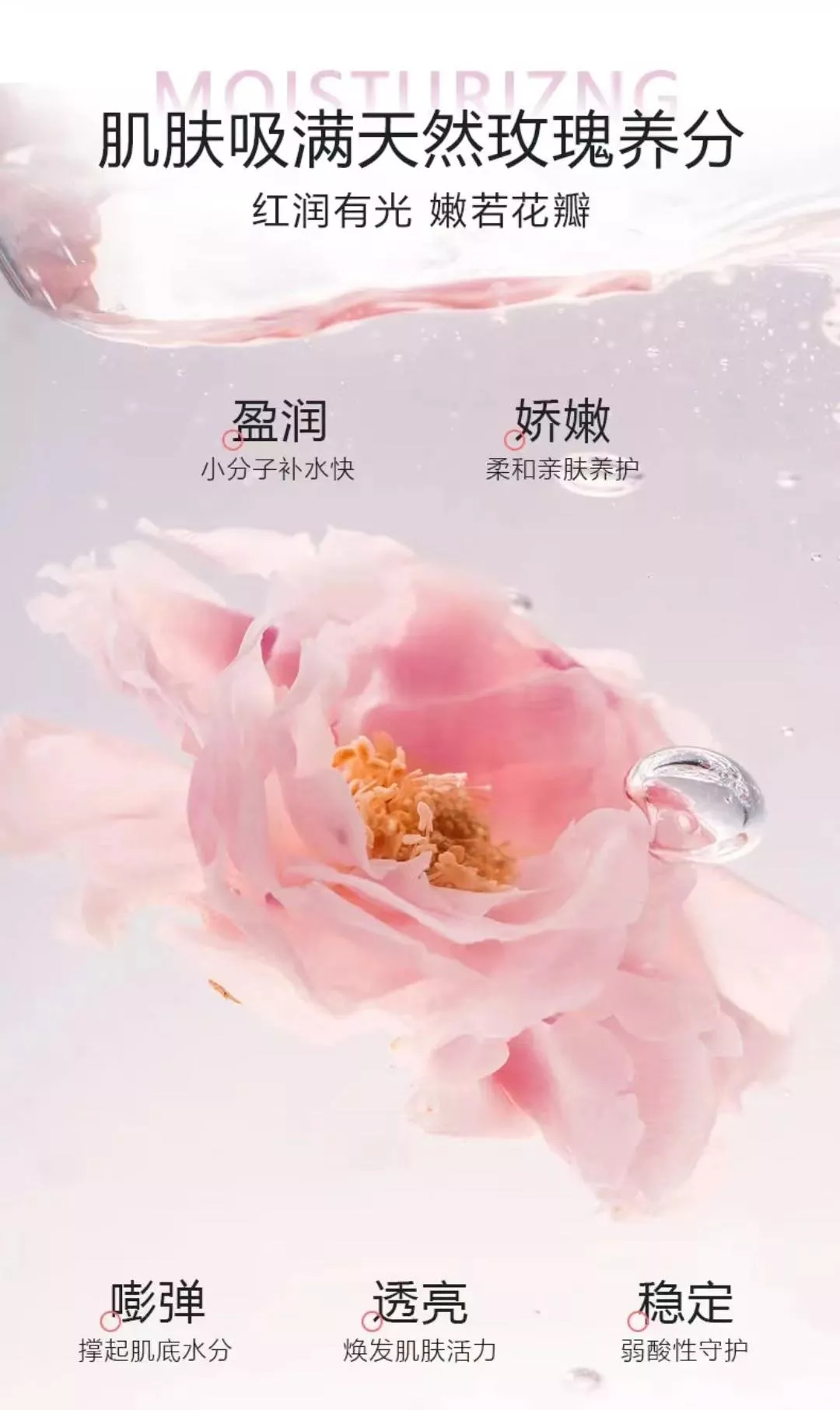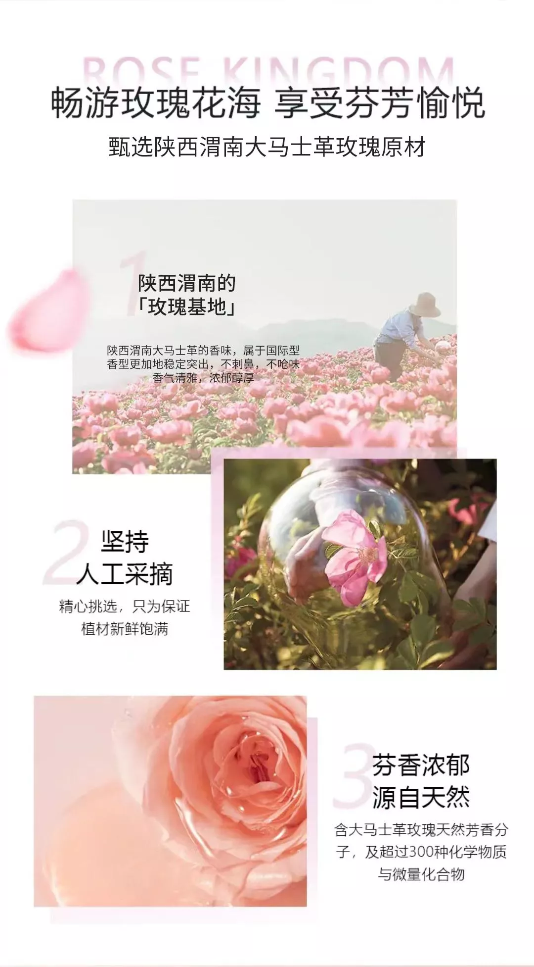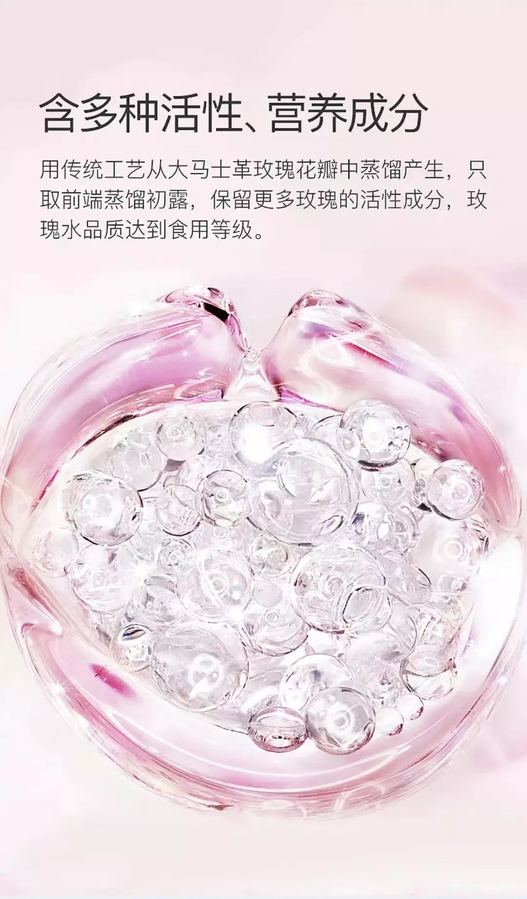 每1000ml的大馬士革玫瑰純露,都含有340朵2.9g左右的初綻玫瑰,包含豐富的玫瑰精油,滴滴菁純 專為明媚水光肌膚而生